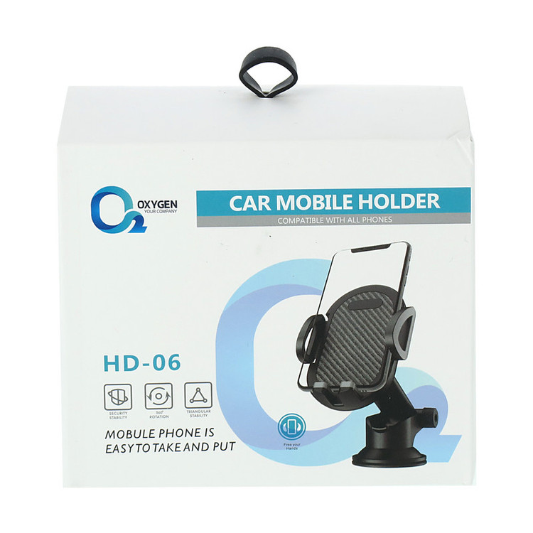 هولدر مدل HD-06 از برند OXYGEN می باشد. این پایه های نگهدارنده دارای فک هایی( نگهدارنده) فنری هستند که با دکمه ای که در پشت آن قرار دارد به صورت کشویی به اندازه گوشی موبایل و یا هر وسیله ی مورد نظر باز شده و از دو طرف آن را نگه می دارد همچنین بادکش های پلاستیکی چسبنده در انتهای این هولدر، نصب روی داشبورد و یا شیشه ماشین را به راحتی امکان پذیر می کند. قسمت نگهدارنده گوشی قابلیت چرخش 360 درجه را داشته تا در زوایای دلخواه مورد استفاده قرار گیرد. این محصول از جنس پلاستیک فشرده و از کیفیت ساخت بالایی برخوردار است و امروزه به دلیل ترند شدن فیلم برداری در ماشین در فضای مجازی و استفاده زیاد از موقعیت یاب ها کاربرد عمومی دارد.